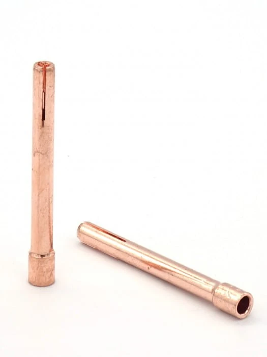 Wysokiej jakości tulejka zaciskowa o długości 50 mm, zaprojektowana do pewnego i stabilnego mocowania elektrody wolframowej w profesjonalnych uchwytach spawalniczych TIG. Jest to kluczowy element eksploatacyjny, który odpowiada za prawidłowy transfer prądu spawalniczego na elektrodę oraz stabilność łuku.