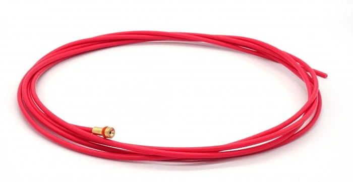Przedstawiamy wysokiej jakości wkład prowadzący wykonany z czystego teflonu (PTFE) w kolorze czerwonym. Jest to kluczowe akcesorium do uchwytów spawalniczych MIG/MAG o długości 5 metrów, które zastępuje standardowe spirale stalowe w celu wyeliminowania tarcia i zanieczyszczeń drutu.